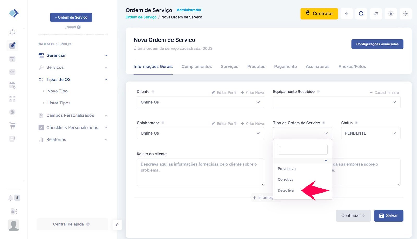 Como cadastrar um novo tipo para sua Ordem de Serviço?