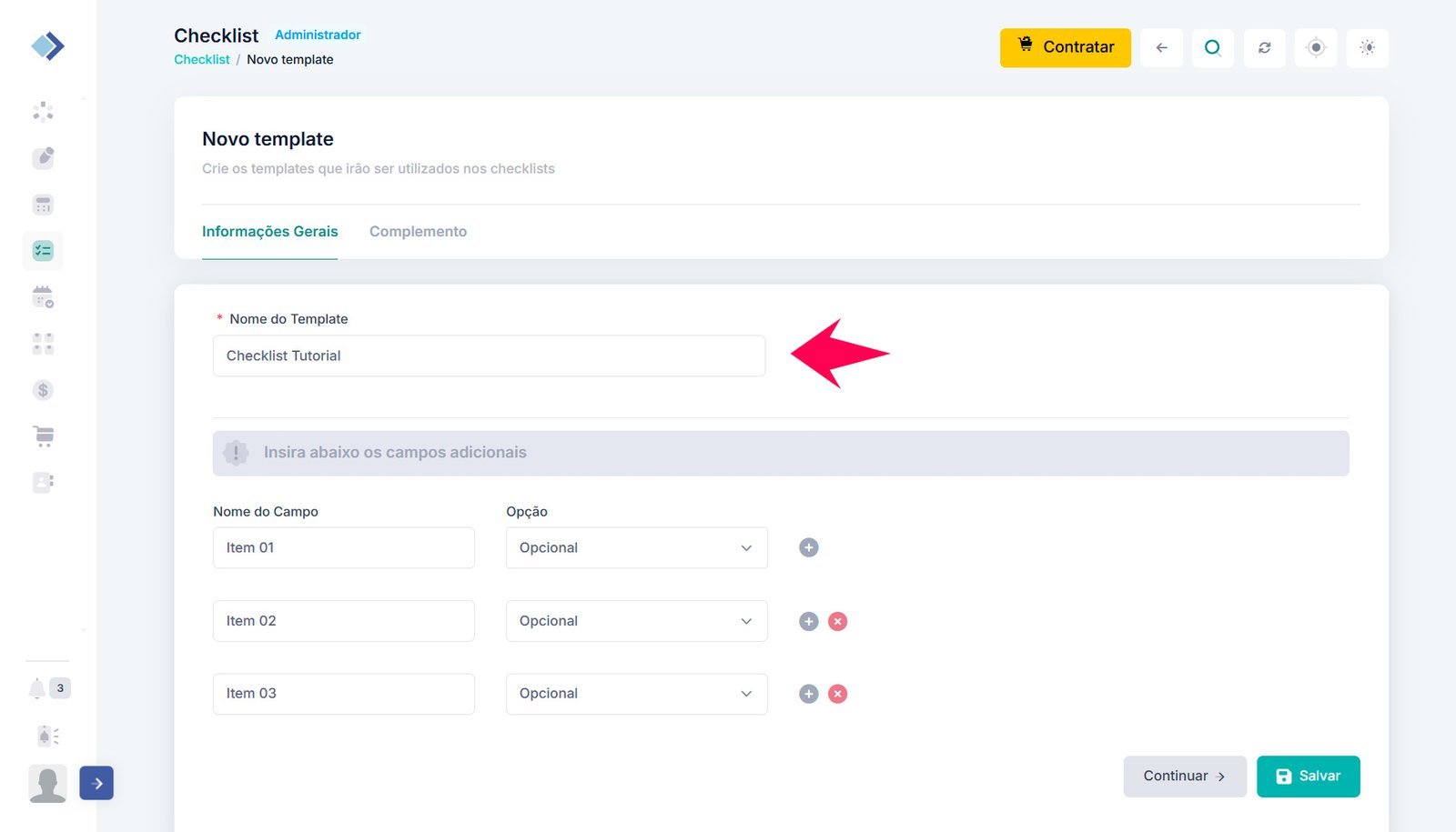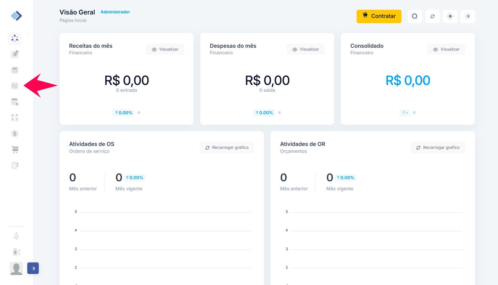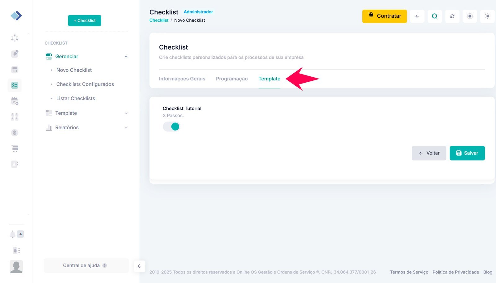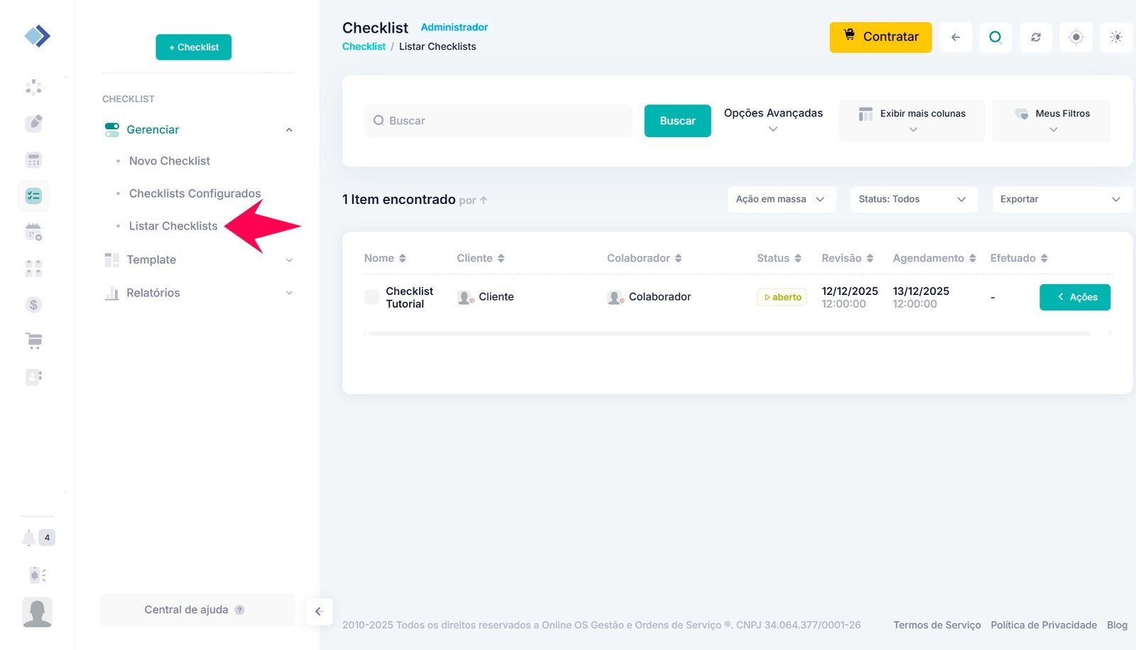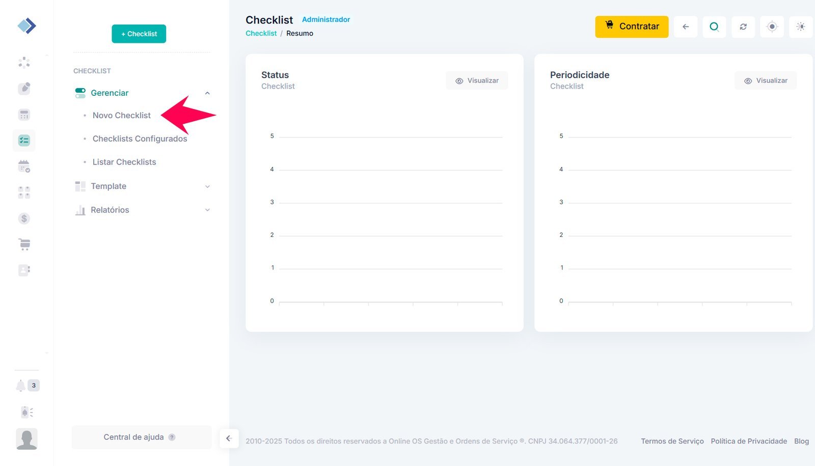 1 – No menu de módulos, localizado ao lado esquerdo, clique em Checklist.