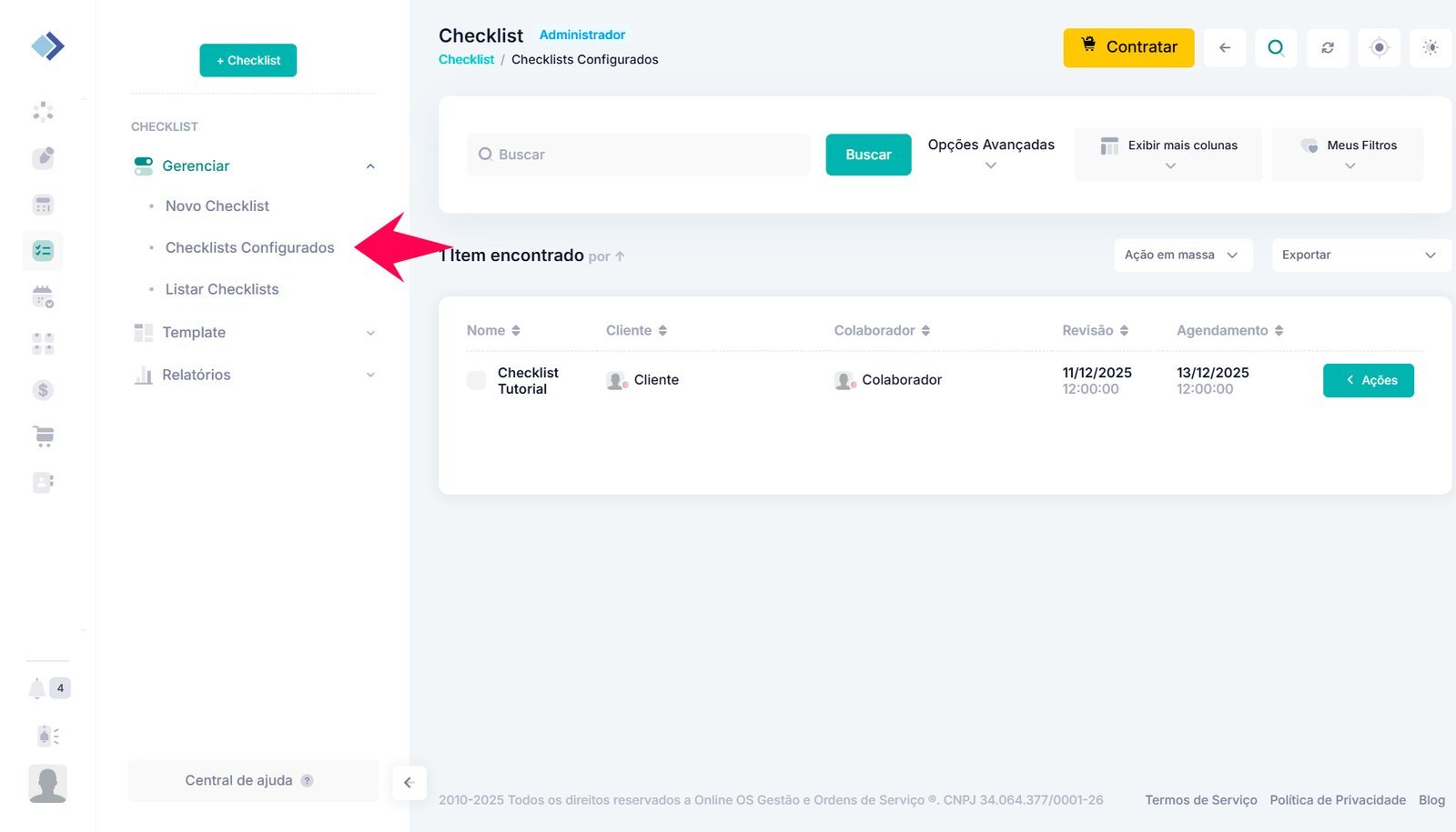 8 – Os checklists configurados podem ser visualizados em Checklist > Gerenciar > Checklists Configurados.