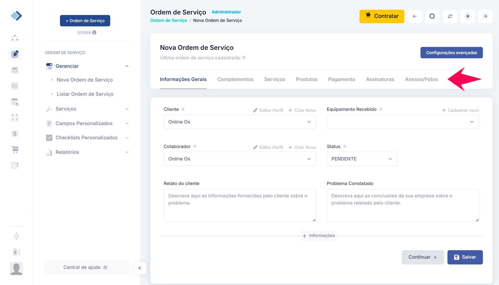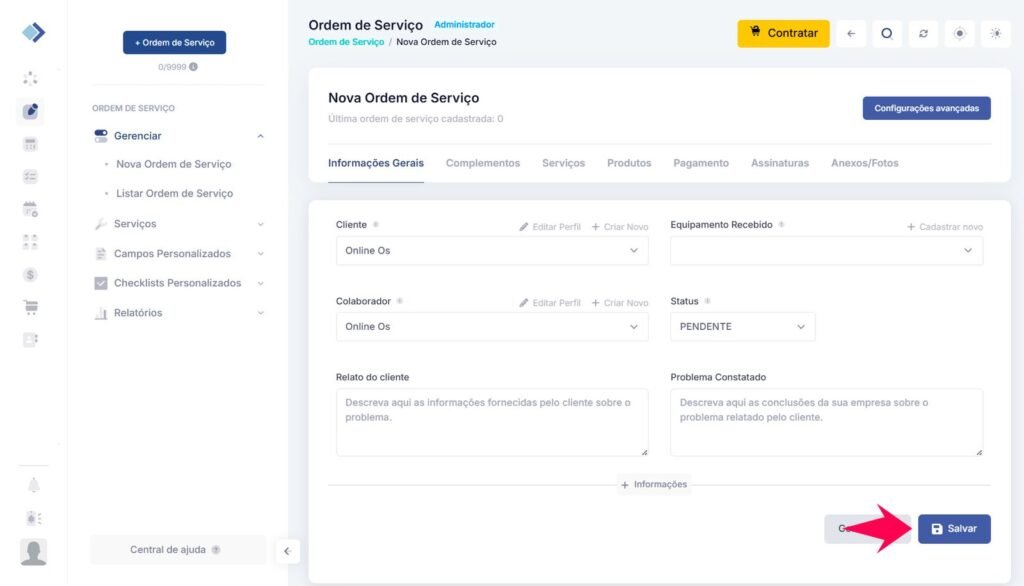 Para criar uma ordem de serviço no Online OS, siga estes passos: