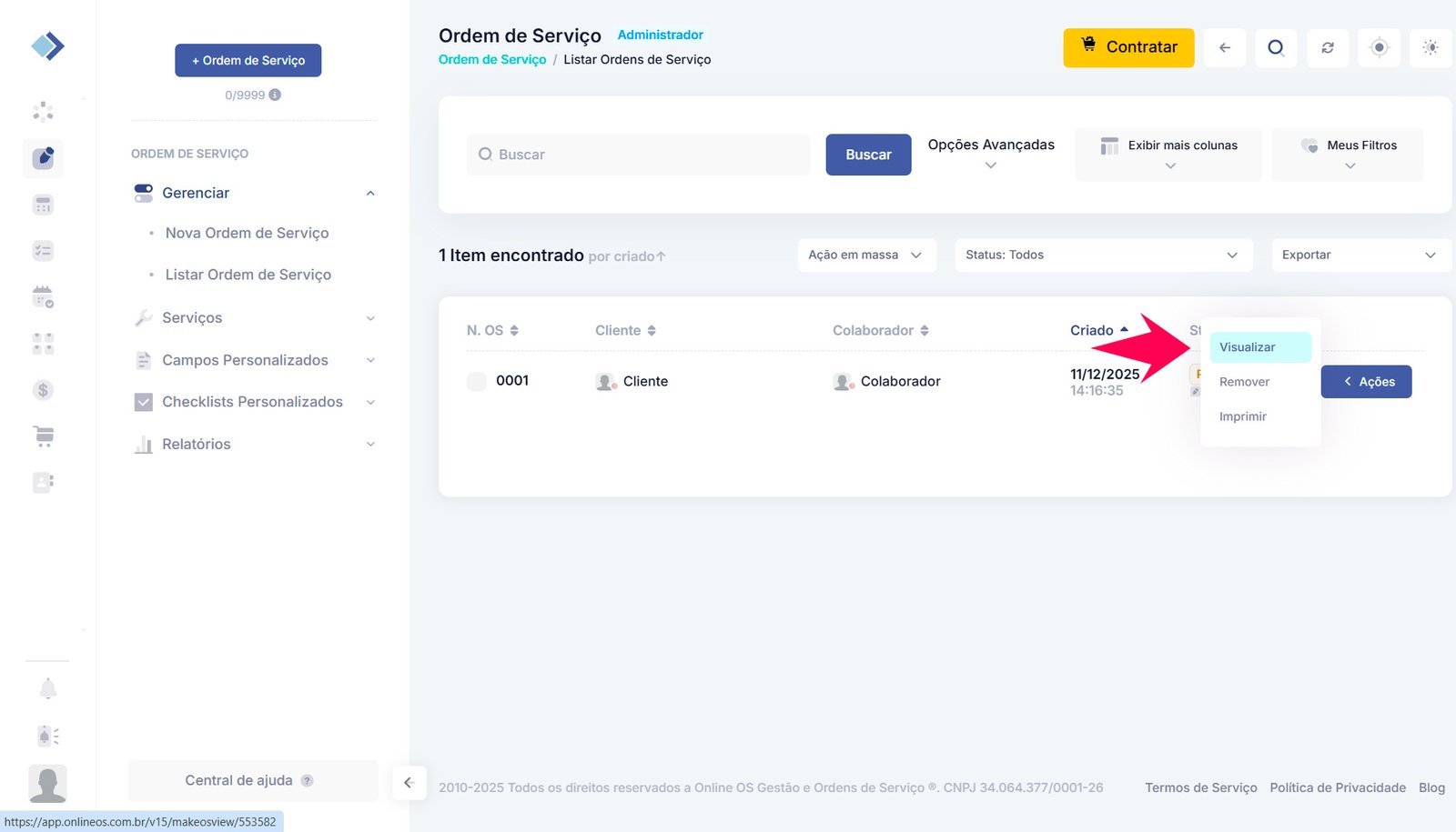 3 – Na ordem de serviço que deseja editar, clique no botão Ação e depois na opção Visualizar.