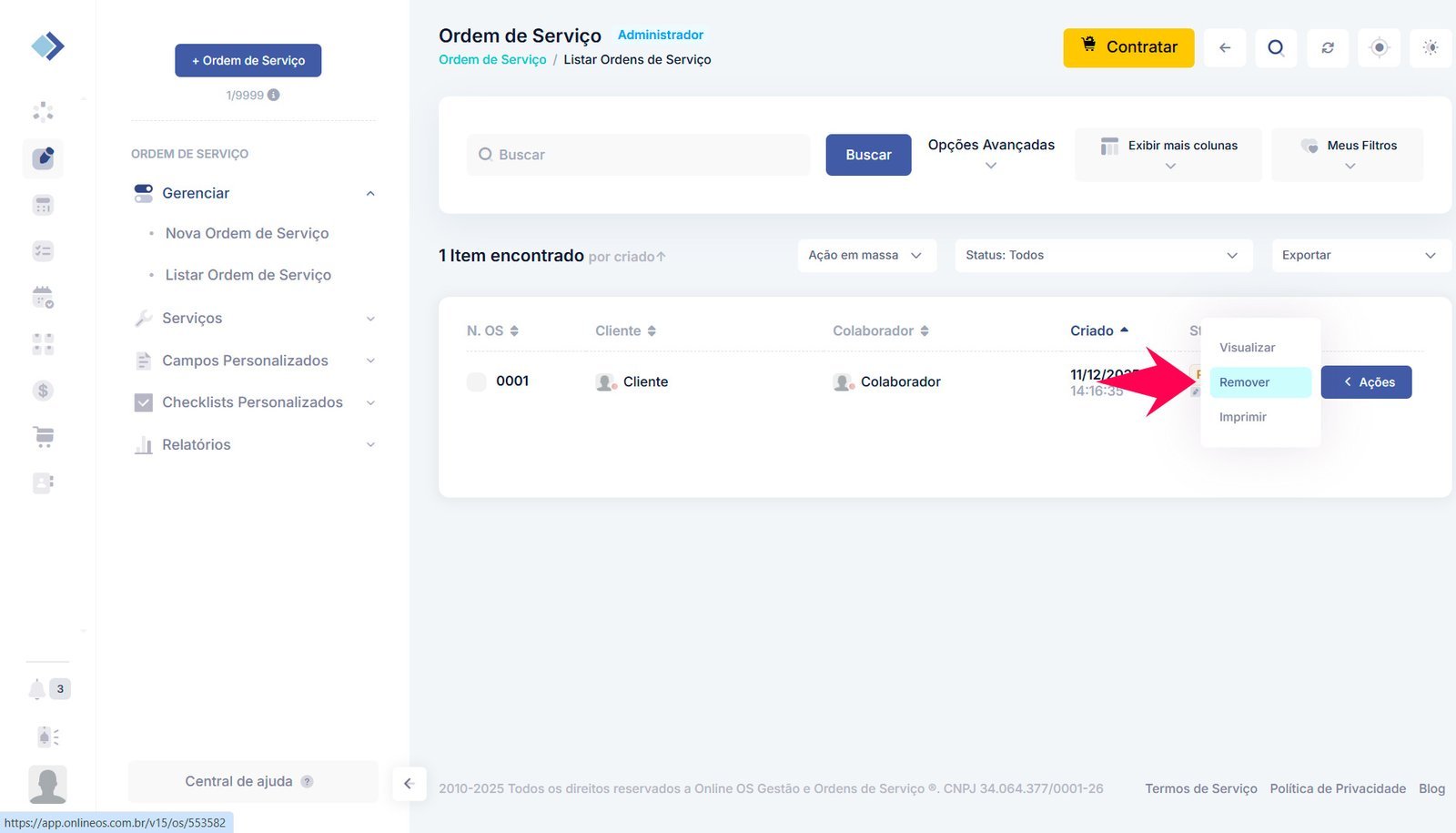 3 – Na ordem de serviço que deseja excluir, clique no botão Ação e depois na opção Remover.