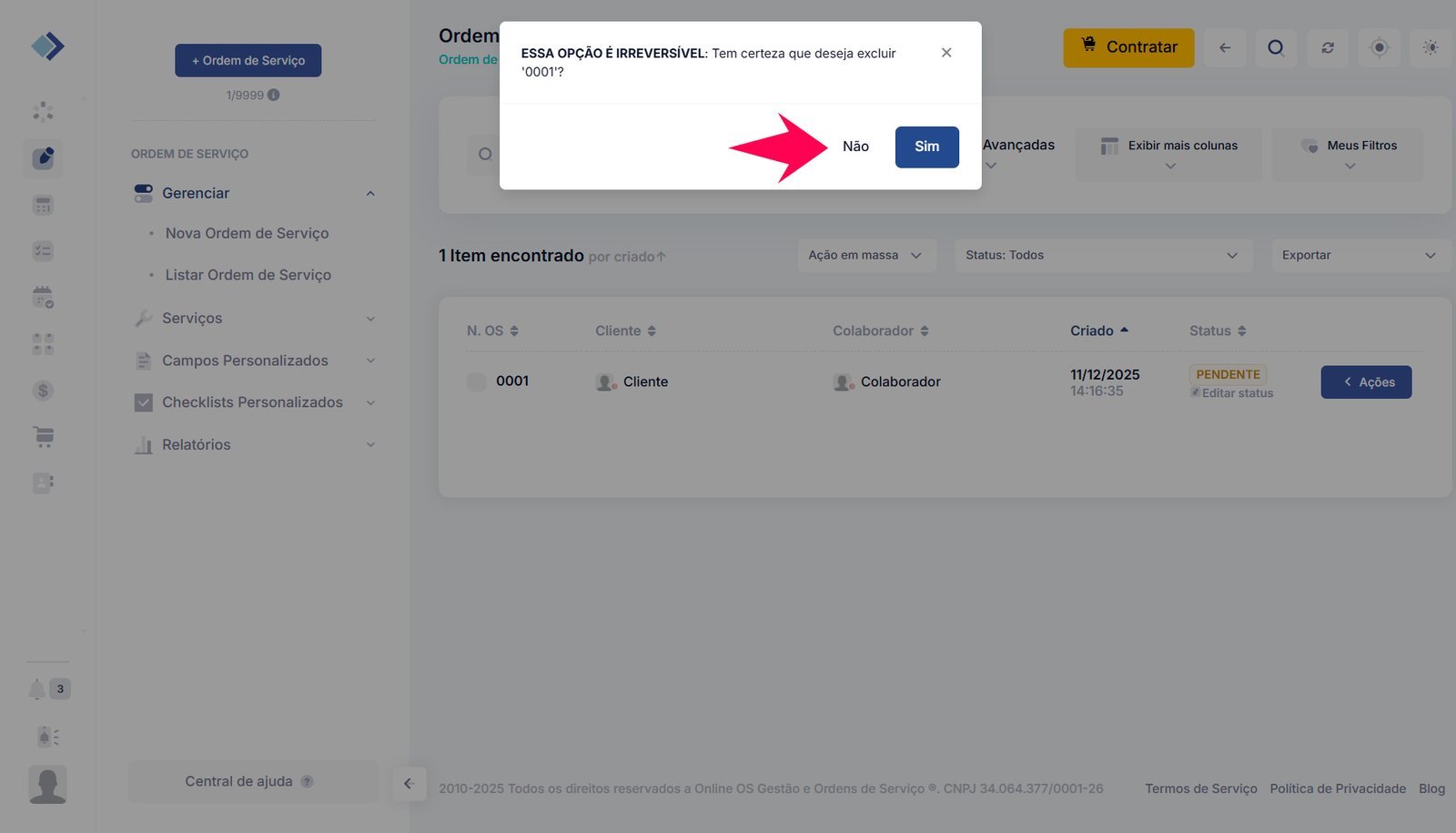 4 – Será exibida uma mensagem pedindo confirmação para excluir a ordem de serviço. Se tiver certeza, clique em Sim. Lembre-se de que essa ação é irreversível.